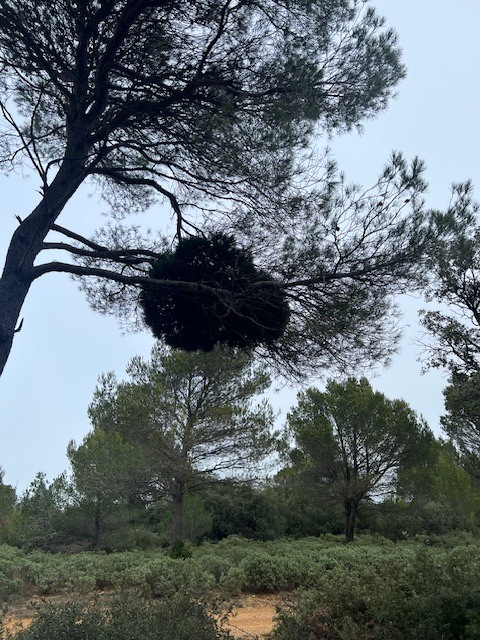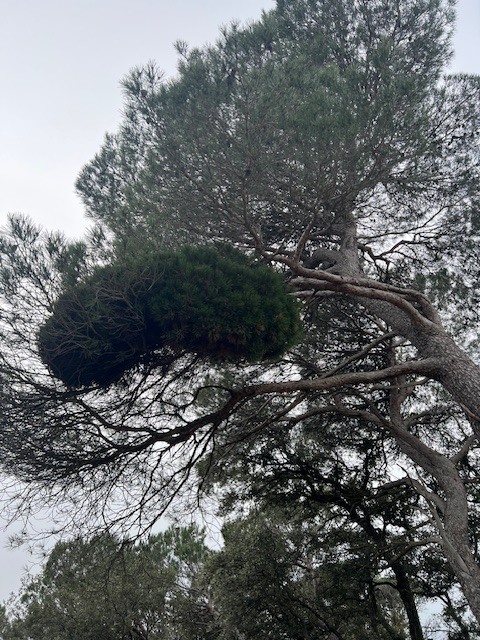 Sur un pin d’Alep, cet amas d’aiguilles bien vivantes, bien vertes, bien différentes de l’arbre hôte. Ca fait plusieurs fois que je passe voir cet arbre, ça fait donc plusieurs années que ça dure.