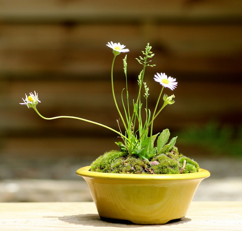 Désolé de faire le rabas joie, mais dans la version traditionnelle japonaise, la plante d'accompagnement ne doit pas être fleurie. la sobriété est de mise, et seul l'arbre doit être mis en valeur. La plante n'étant là que pour illustrer la saison.