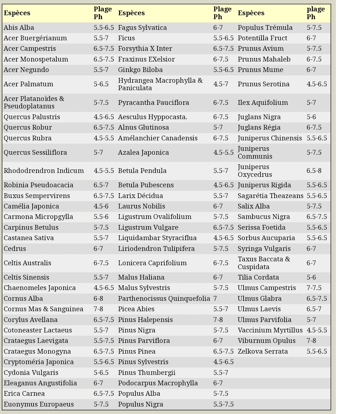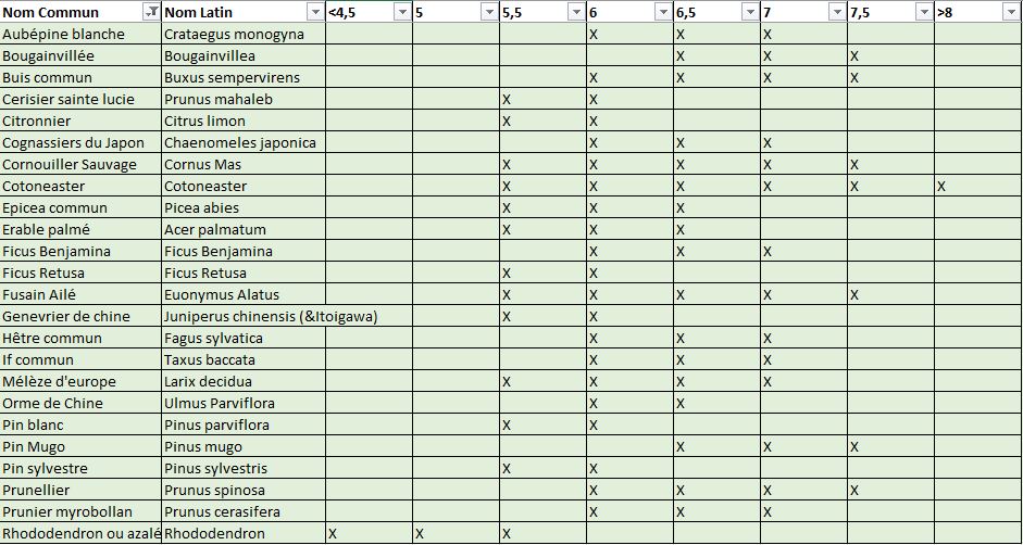 Bon en tous cas j'en suis arrivé à la conclusion que je ne pouvais pas négliger l'aspect pH dans ma culture. Je me demandais par exemple pourquoi mes Mugos avaient une couleur magnifique et mes Sylvestres jaunasse. Et quand je vois le calcaire qui s'accumule sur les goutteurs, j’imagine que c'est la même chose dans le substrat. J'ai trouvé un site, https://www.lescompagnonsdubonsai.com/techniques-cultures/humus-ph/, qui a listé les pH recommandés en Bonsai. E t bien la plage de PH est complètement différente ! Le mugo de 6,5 a 7,5, le sylvestre de 5,5 a 6,0. Je me suis fais un tableau avec les espèces que je cultive, pour en arriver à la conclusion qu'un pH de 6,5 serait le meilleur compromis. Toujours pas assez acide pour les Sylvestres, mais surement mieux que les 8,4 de mon eau de réseau. Avec un peu d'écorce de Pin dans le substrat ça pourra peut être s'arranger.